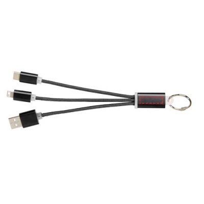 Metal 3-i-1 laddningskabel med nyckelring. 3-i-1 laddningskabel med nyckelring. 3-i-1 laddningskabeln med nyckelring har en 1 C, 1 USB typ A och en 2-i-1 kompatibel dubbelport för både Apple iOS och Android-enheter. Kommer med en nyckelring. För att ladda Apple-enheter sätter du i kabeln, med den sida som är utan stift, i enheten och för att ladda Android-enheter sätter du i kabeln med den sida som har stift. Aluminium.