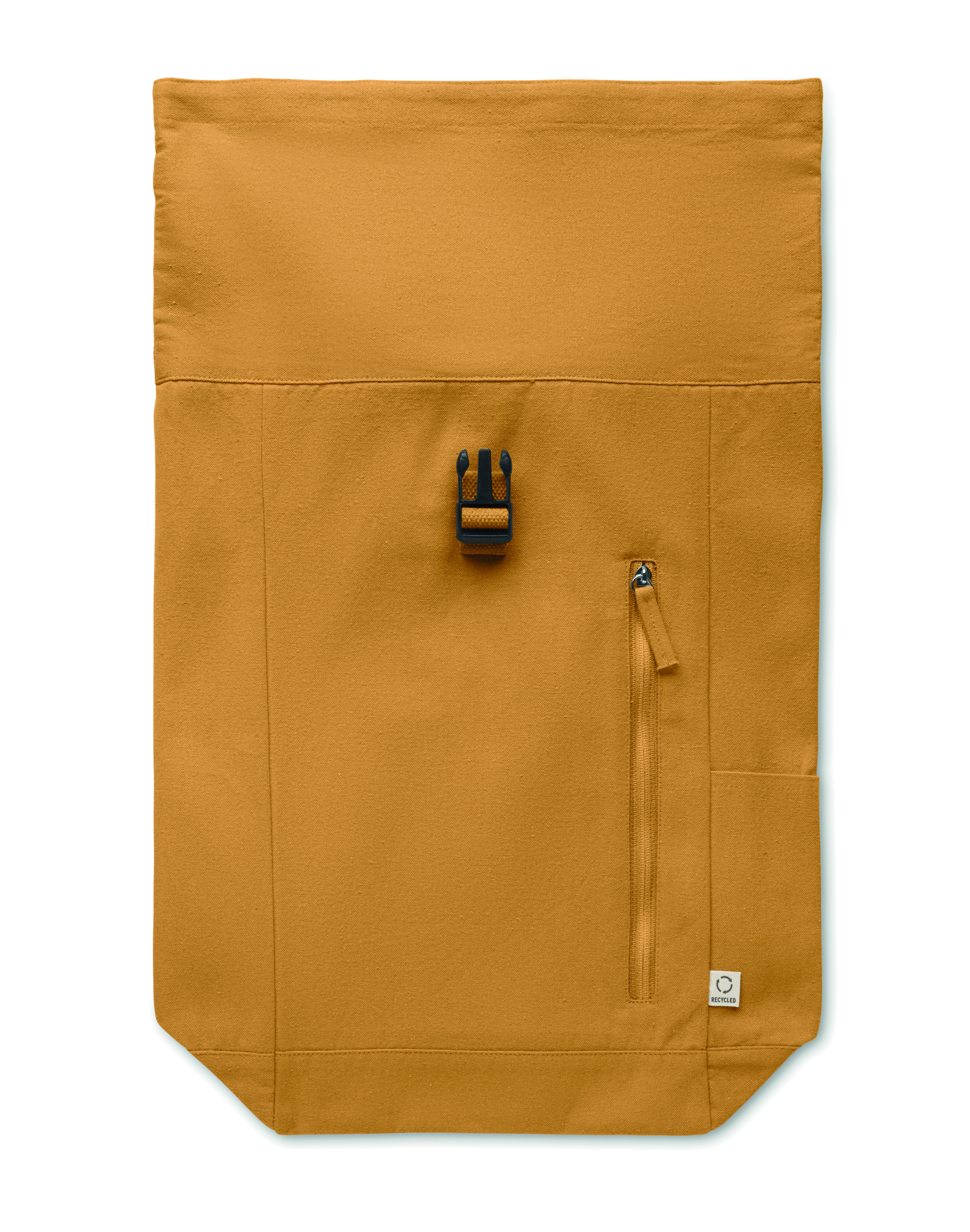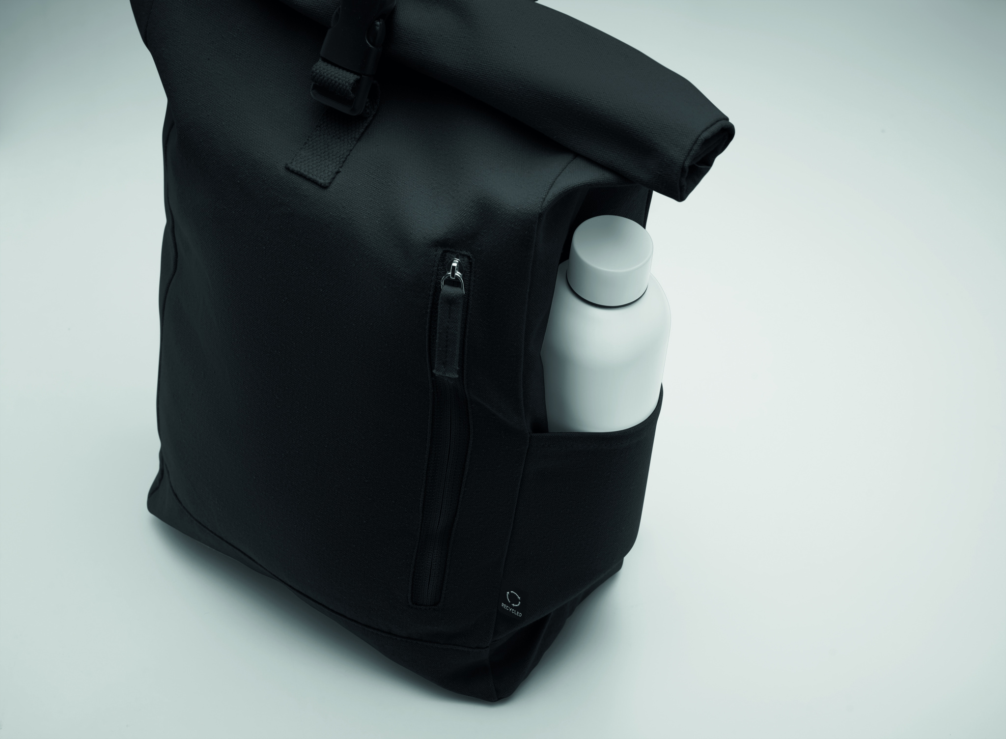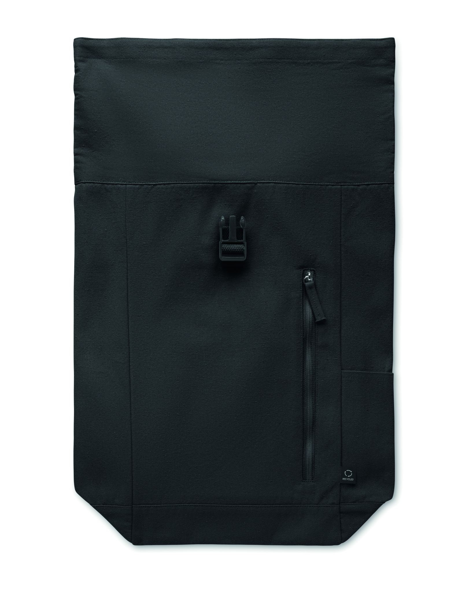 Rolltop-ryggsäck med kardborrestängning i 390 gr/m² återvunnen bomull (80%) och återvunnen polyester (20%). Ficka med dragkedja på framsidan.
