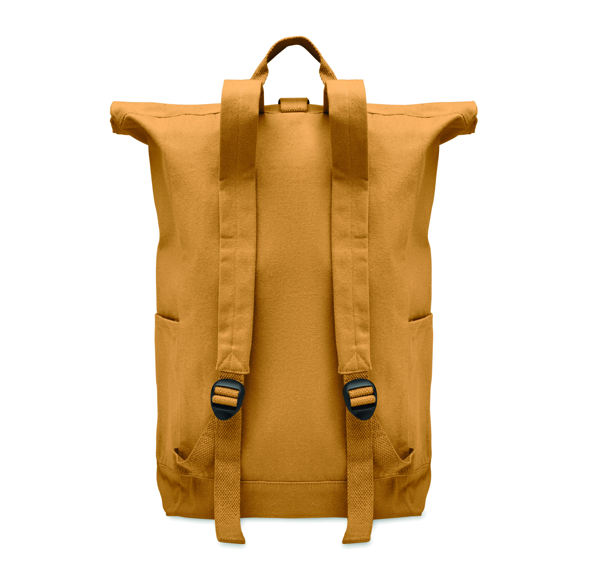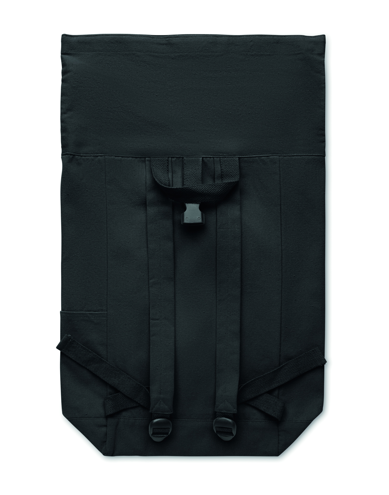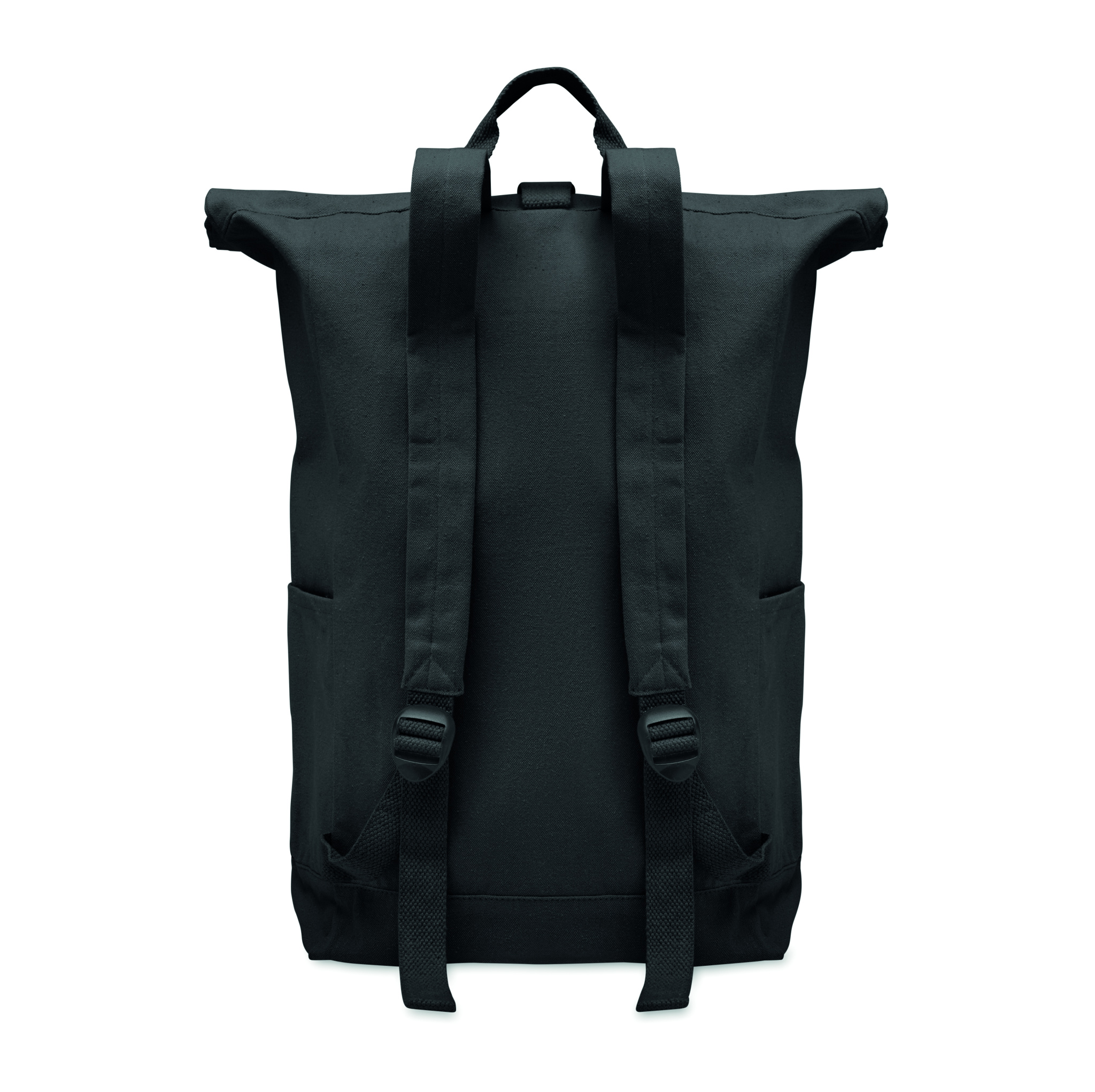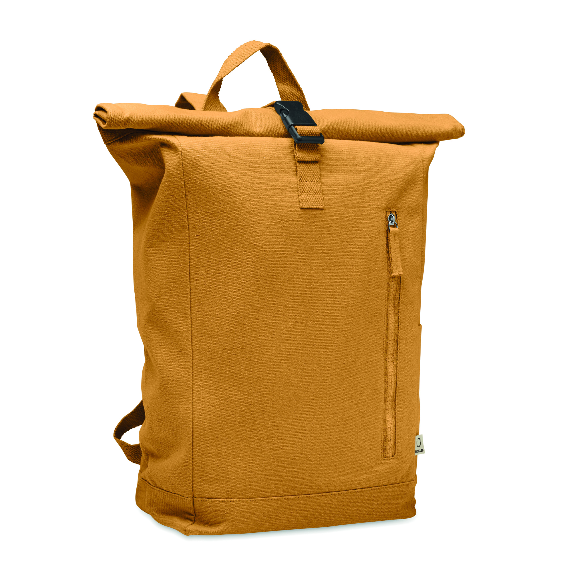 Rolltop-ryggsäck med kardborrestängning i 390 gr/m² återvunnen bomull (80%) och återvunnen polyester (20%). Ficka med dragkedja på framsidan.