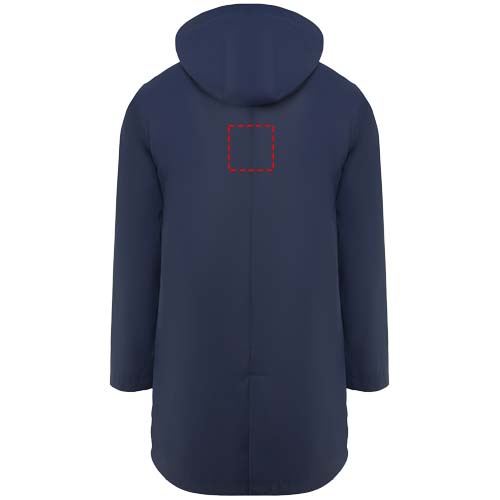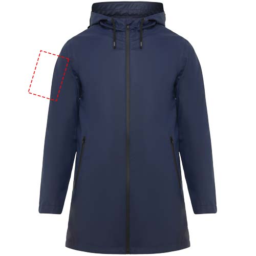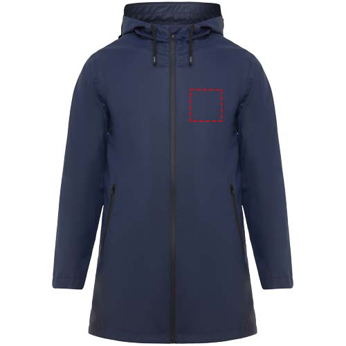 Vattentät regnjacka. Huva med topp. Värmeförseglade dragkedjor och sömmar. Kontrasterande detaljer i svart. Två sidfickor med dragkedja. Slits i bakre fållen. Borttagbar etikett. Vattentät. Modellen är 185 cm och bär storlek M.