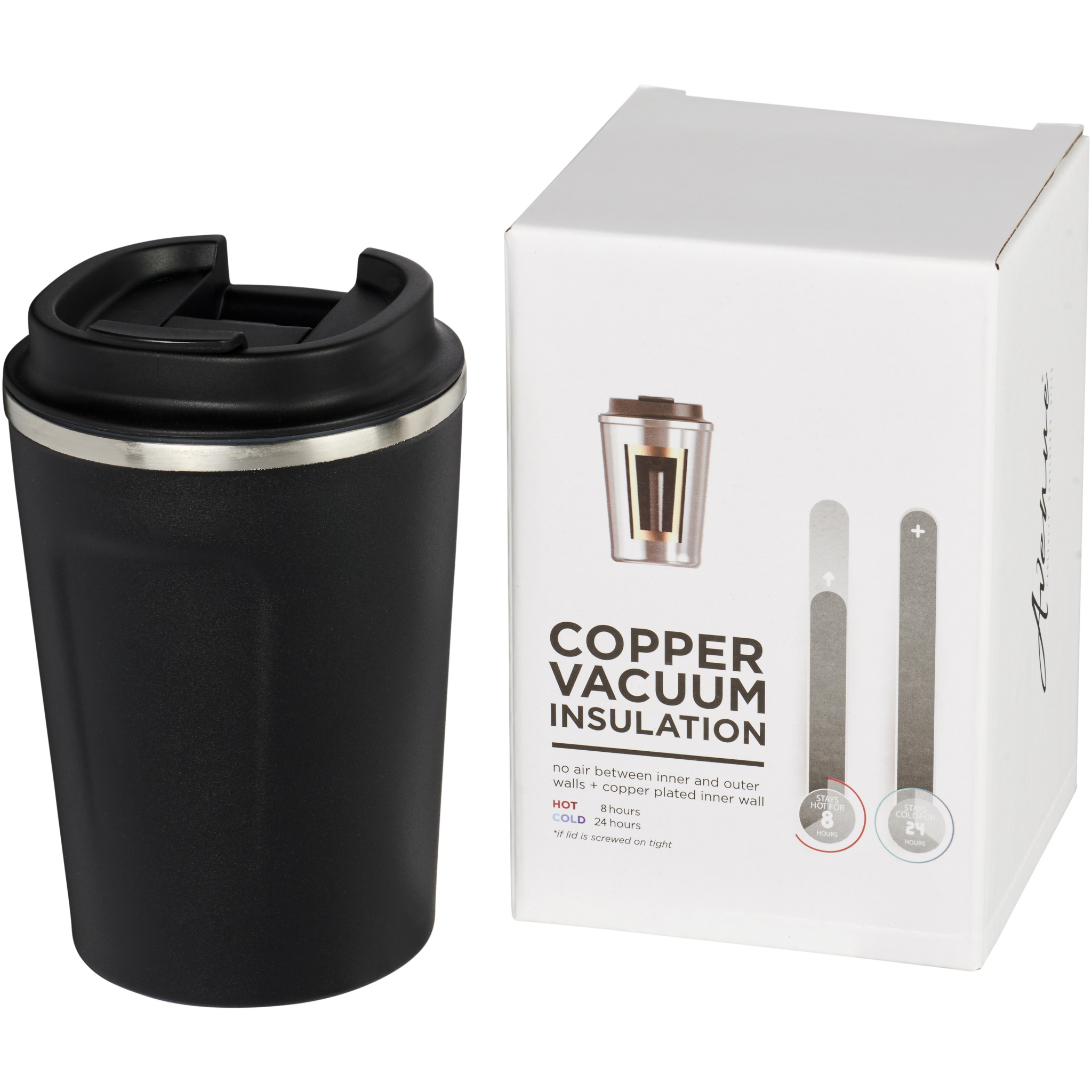 Thor 360 ml läckagesäker vakuumisolerad termosmugg i koppar. Konstruktion med dubbelvägg och vakuum i rostfritt stål med kopparisolering som håller din dryck kall i 24 timmar och varm i minst 8 timmar. Konstruktionen förhindrar också kondens på utsidan av termosen. Läckagesäkert skruvlock. Trendig och tålig pulverlackering. Volymkapacitet 360ml. Levereras i en presentförpackning av Avenue. Rostfritt stål.