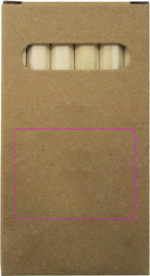 6 korta kritor i en kartong. Vi trycker din logotyp ovanpå kartongen i önskad färg.